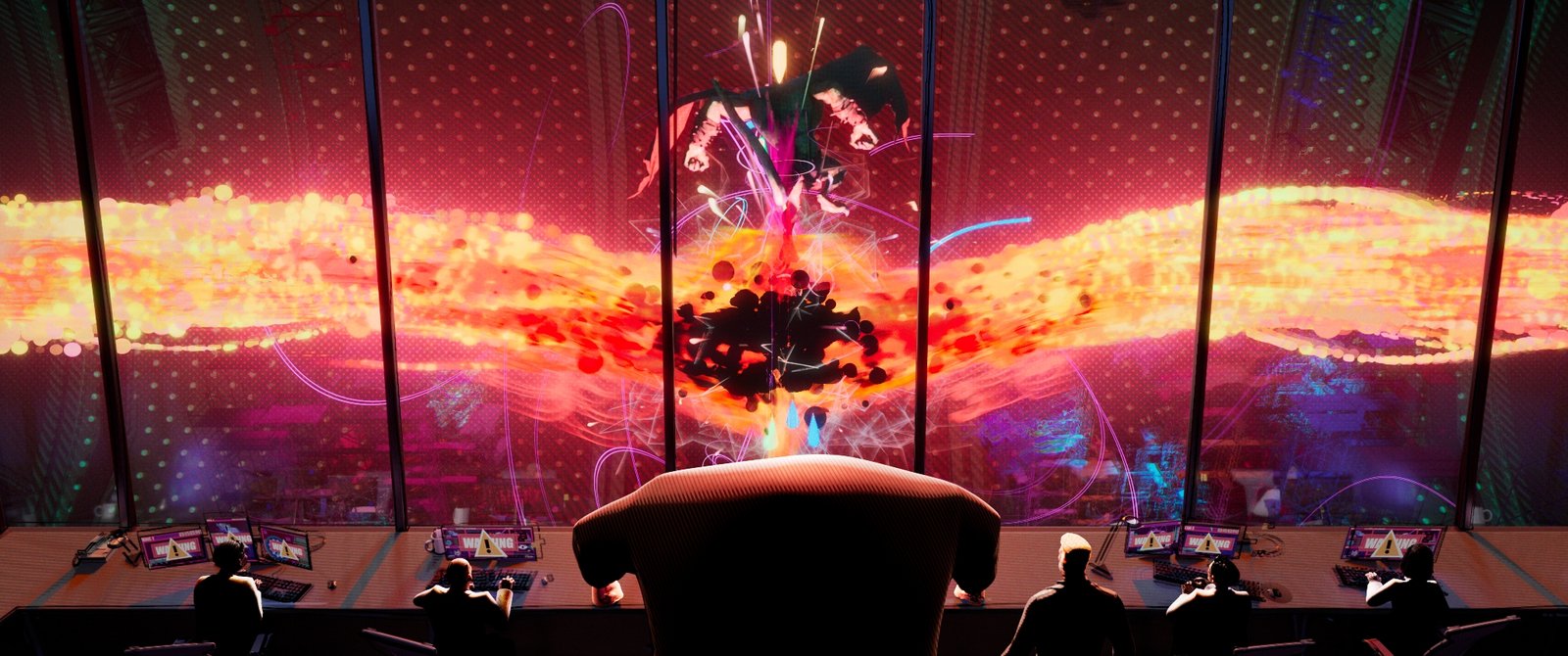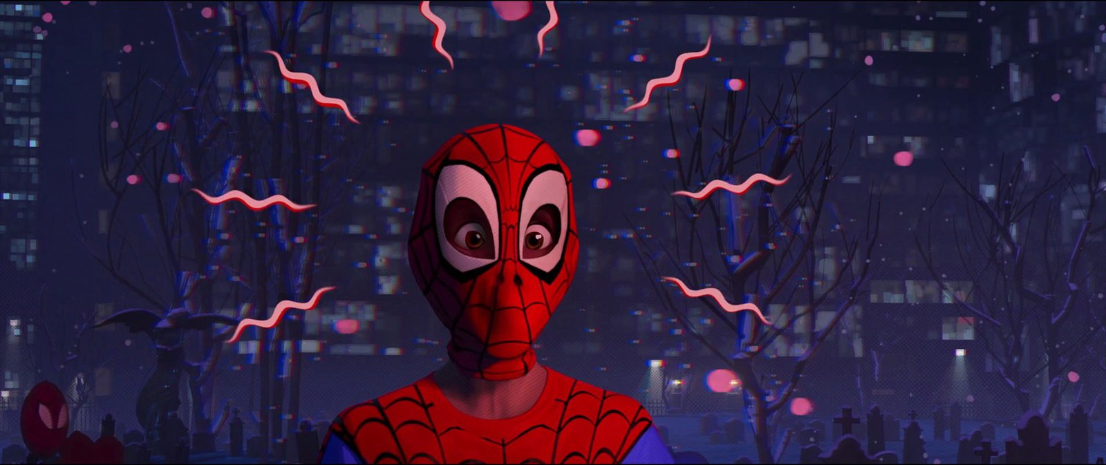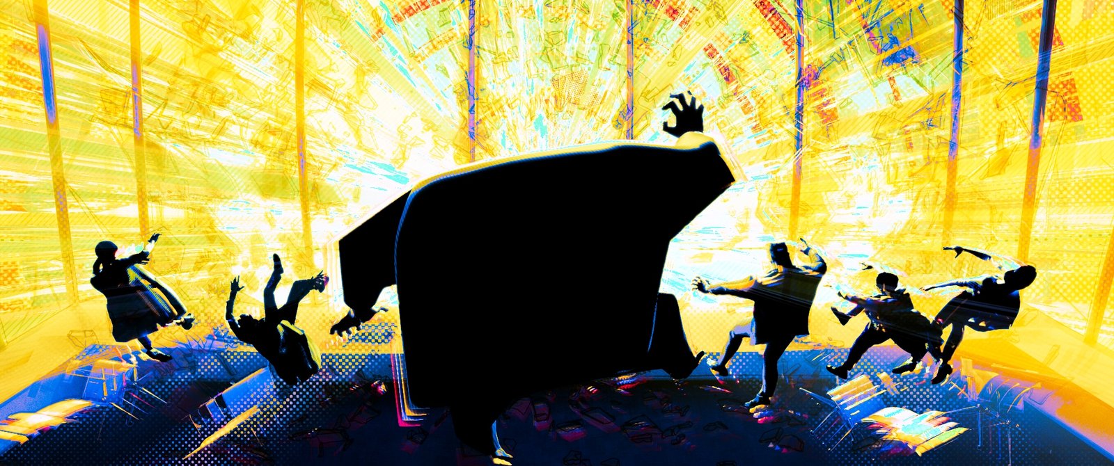 Filmdeki stilize edilmiş FX'in bir başka harika örneği, çarpıştırıcının birden çok Spider-Verse ile uğraşarak serbest bıraktığı çok boyutlu glitching efektleridir. Bu glitch efektini yaratmak için, animasyon birden çok kamera açısıyla işlenir ve her biri benzersiz bir görünümle işlenir. Bu çoklu oluşturmaları Örümcek Ayetlerinin 3B kırılmasında birleştirmek için bir ekran alanı hücre deseni kullanılır.
